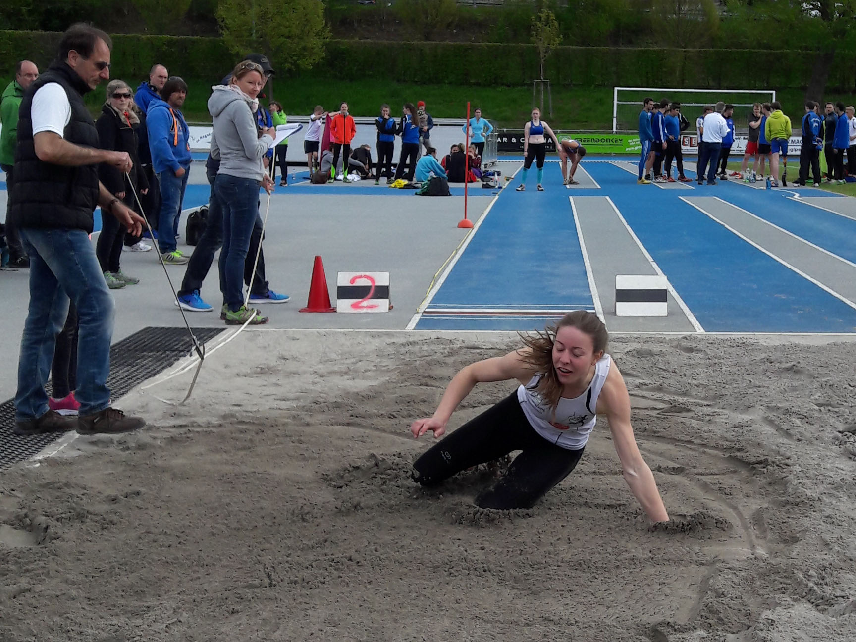 Etwas später am Wettkampftag ging Kathrin über 100m und dem Weitsprung an den Start. Sie startete in der Altersklasse Frauen und durchquerte die Ziellinie nach 13,46 sec, was einem sehr guten 3. Platz entsprach. Die zweite Disziplin, der Weitsprung, wurde zusammen mit den Altersklassen U18 und U20 durchgeführt. Hier erreichte Kathrin nach einer kontinuierlichen Steigerung von Sprung zu Sprung eine Weite von 4,76m und belegte auch hier nochmals den 3. Platz.